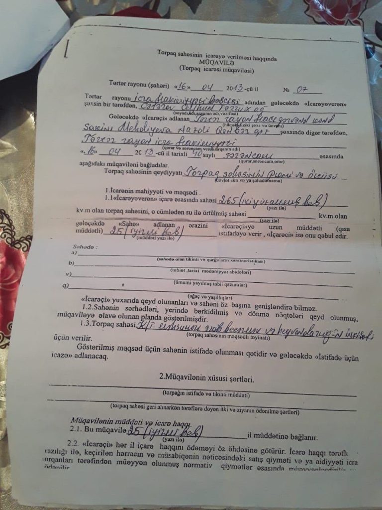Nazdı Mehdiyevanın icarə müqaviləsinin bitməsinə 18 il qalıb. Aidiyyəti qurumlara müraciət etməsinə baxmayaraq, torpağı hələ də özünə qaytarılmayıb və təsərrüfatını bərpa edə bilməyib:
