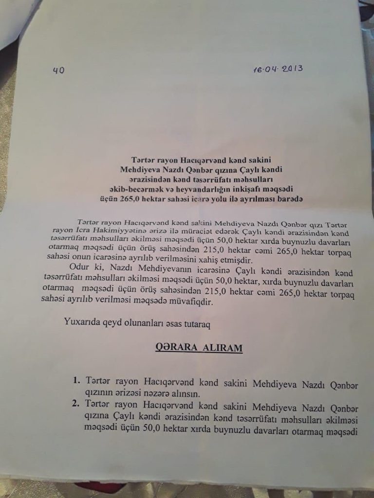 Nazdı Mehdiyeva 2013-cü ildə təsərrüfatını genişləndirmək üçün Tərtər Rayon İcra Hakimiyyətinin keçmiş başçısı Ceyhun Cəfərovla icarə müqaviləsi bağlayaraq “boz irəmə” adlanan ərazidən 265 hektar əkinə yararsız torpağı 25 illik icarəyə götürüb. Həmin sahədə heyvandarlıq təsərrüfatı qurub və 20 ailəni bu təsərrüfata cəlb edib. Ancaq deməsinə görə, insanlar bu təsərrüfatdan cəmi üç il dolana biliblər. Belə ki, Ceyhun Səfərovdan sonra icra hakimiyyətinə başçı təyin olunan (2014-cü il) Müstəqim Məmmədov 2016-cı ildə heyvandarlıq təsərrüfatına əl qoyub.