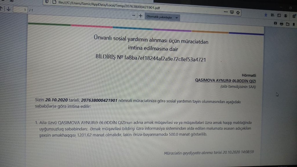 Bunu Meydan TV-yə Hövsan sakini Rəna İsmayılova deyir. Onun sözlərinə görə, 1 il əvvəl qızı Aynurə Qasımovanın həyat yoldaşı vəfat edib. İki azyaşlı nəvəsi atasız qalıb. Atanın vəfatına görə dövlət uşaqların hərəsinə aylıq 80 manat müavinət kəsib. Ancaq toplam 160 manatın bir hissəsi kommunal borclara, bir hissəsi çörəyə zorla çatır. Ona görə də Aynurə Qasımova dövlətdən əlavə yardım istəyib. Əvvəlcə o, pandemiyaya görə işsizlərə ödənilən 190 manat birdəfəlik yardıma görə müraciət edib. Ancaq imtina cavabı alıb.