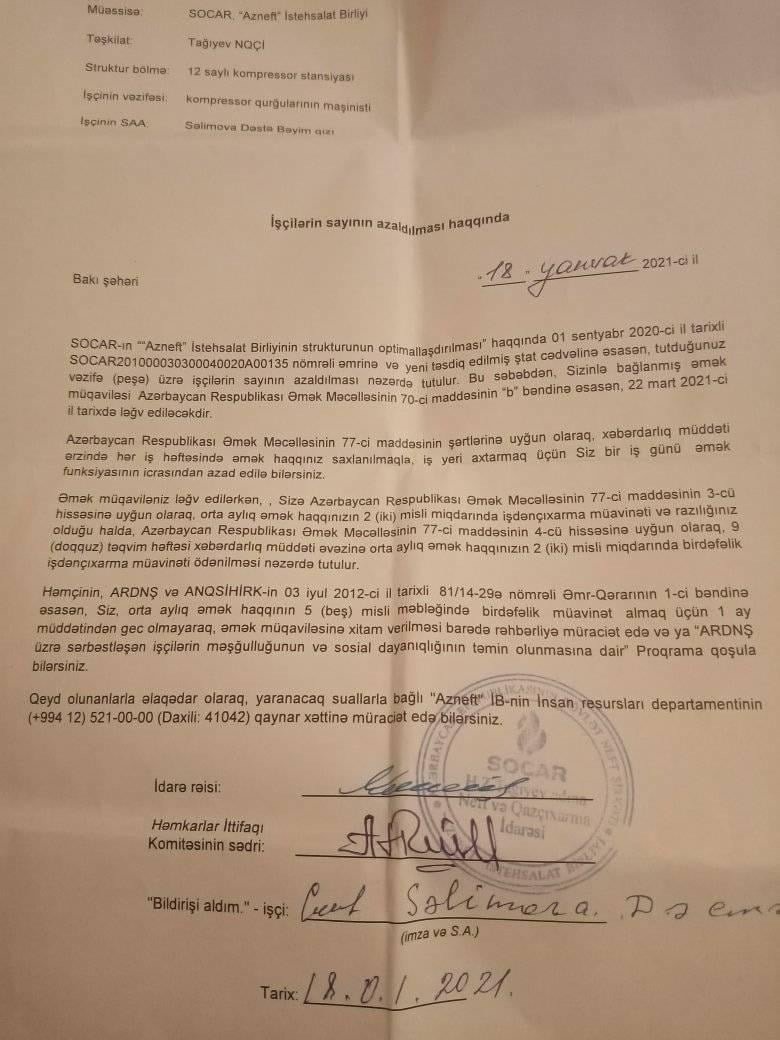 Mirvari Qəhrəmanlı bildirib ki, dünənədək artıq 300-dən çox işçiyə bildiriş verilib: “Tağıyev adına Neft-Qaz Çıxarma İdarəsində artıq 47 şəxsə işdən ayrılması üçün sənəd imzaladıblar. “Bibiheybətneft”dən 142 işçiyə ixtisar olunmaları ilə bağlı bildiriş verilib. Əlimizdə onlarla imzalanmış bildirişlər var” .
