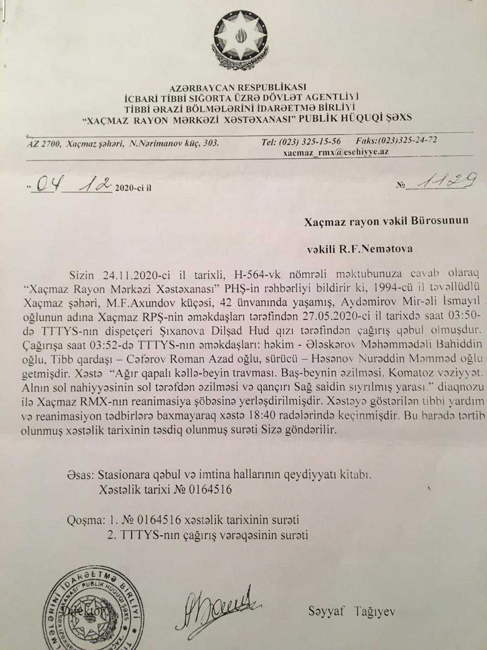 Tibbi Ərazi Bölmələrini İdarəetmə Birliyindən İsmayıl Aydəmirovun vəkilinin sorğusuna göndərilən cavabda göstərilib ki, gecə saat 03.52-də təcili yardım briqadası çağırış əsasında polis şöbəsinə gedib: “Xəstə ağır qapalı kəllə-beyin travması, baş-beyin əzilməsi, komatoz vəziyyət, alnın sol nahiyəsinin əzilməsi və qançırı, sağ saidin sıyrılmış yarası” diaqnozu ilə xəstəxananın reanimasiya şöbəsinə yerləşdirilib. Göstərilən tibbi yardım və reanimasion tədbirlərə baxmayaraq, saat 18.40-da keçinib”.