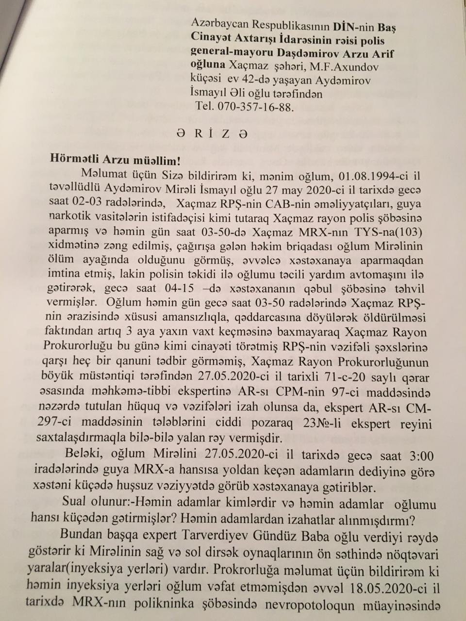 DİN Baş Cinayət Axtarışı İdarəsinin rəisinə ərizə