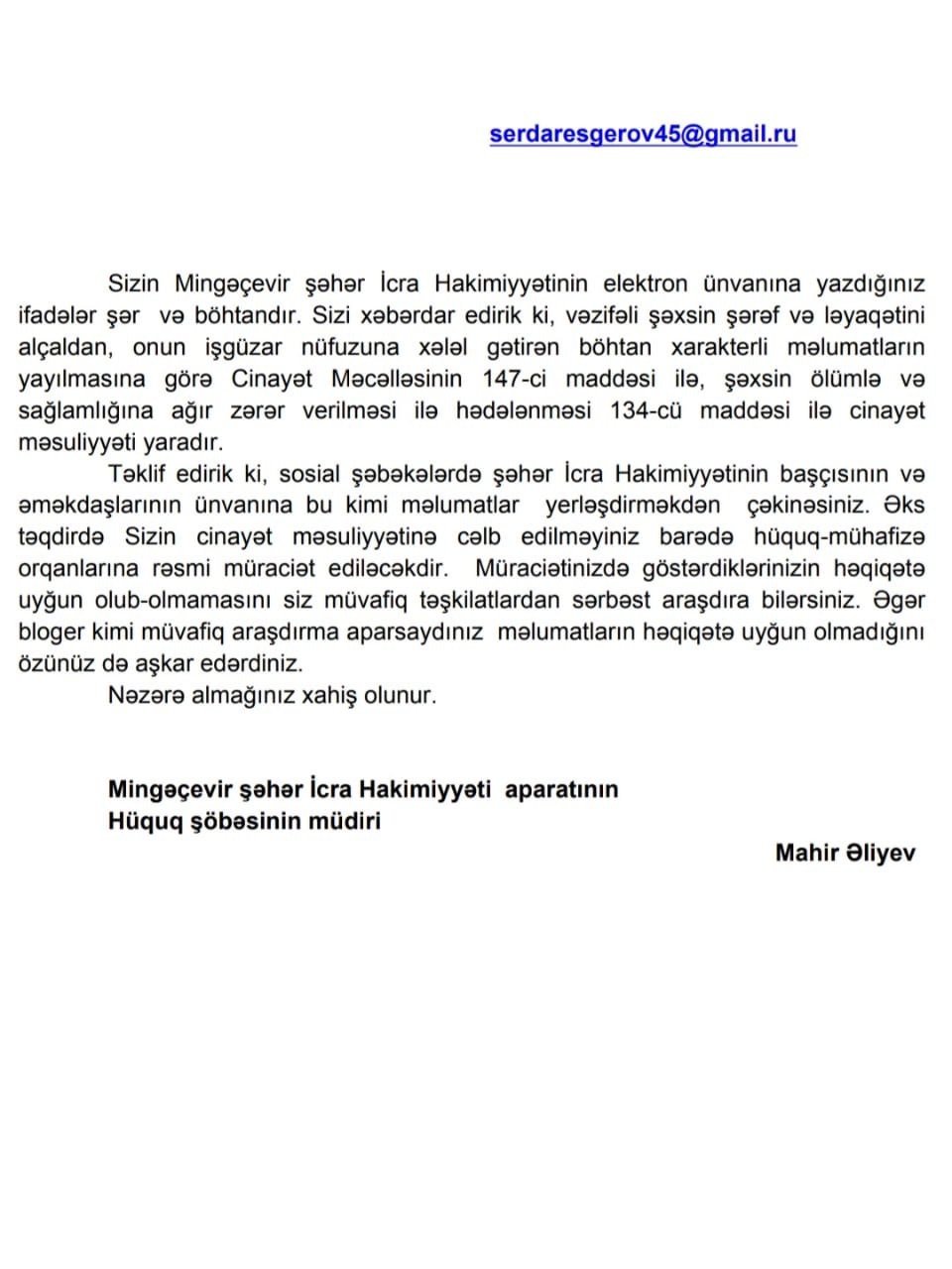 Mingəçevir Şəhər İcra Hakimiyyəti aparatının hüquq şöbəsinin müdirinin cavab məktubu