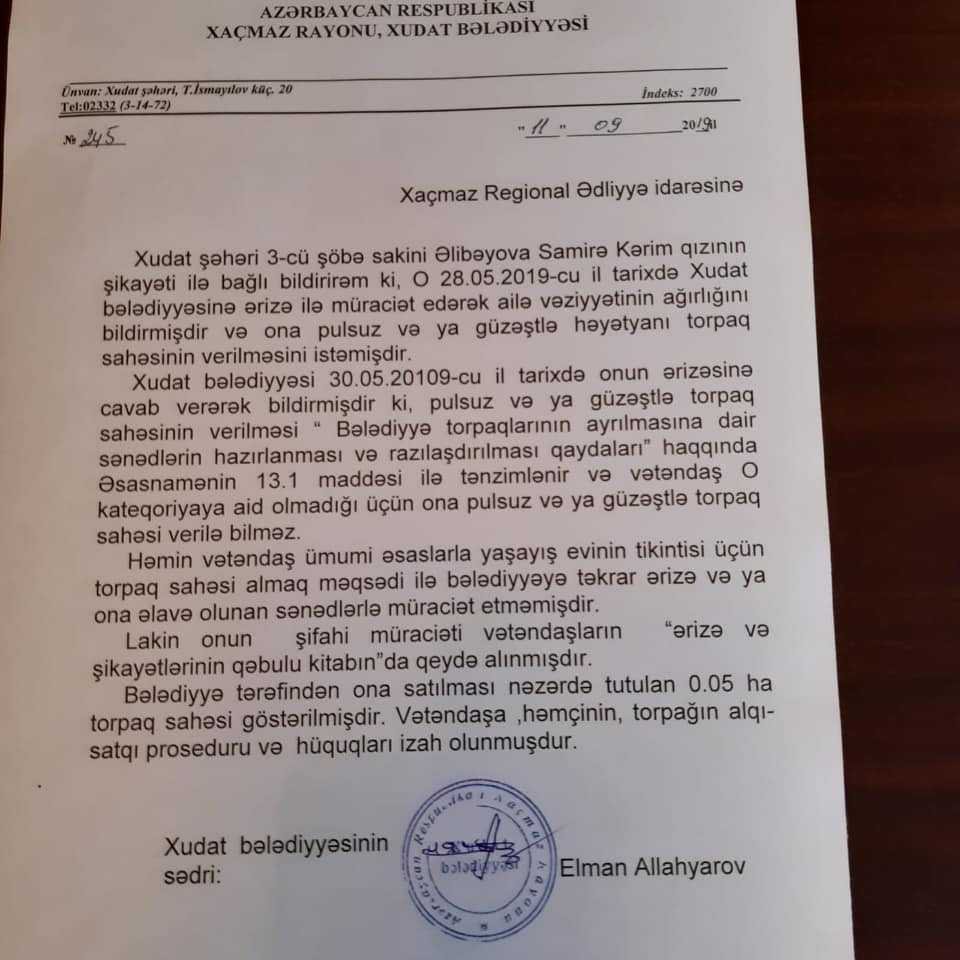 Novruz Məmmədov dediyinə görə, məsələ ilə bağlı aidiyyəti qurumlara müraciət etsələr də, nəticəsi olmayıb: “Xaçmaz Regional Ədliyyə İdarəsində də olmuşuq. Amma bizim şikayətimizə məhəl qoyan yoxdur. Həyat yoldaşım Elman Allahyarovla sonuncu dəfə görüşəndə deyib ki, səndən şikayət edəcəyəm. Yoldaşıma cavabında söyləyib ki, indiyə kimi hara şikayət etmisənsə, bir də elə. İstəyirsən, prezidentə şikayət et. Görünür, bu adam heç kimdən qorxub çəkinmir. Bizə təklif etdiyi ərazidən başqa bir adam torpaq almaq istəyib, ona aşağı qiymət söyləyib. İstəyimiz odur ki, bizə qiymətdə güzəşt olunsun. Torpağı alandan sonra orada ev tikmək lazımdır. Uşaq hərbidədir. Orada kirayə pulu verir. Hər gün ailəsinin yanına gələ bilmir. İkinci Qarabağ müharibəsi zamanı döyüşlərdə olub. Bələdiyyə sədri isə deyir ki, mütləq yaralanmalıdır. Döyüşdə yaralanan döyüşçüyə ev tikilirsə, bir ucuz qiymətə də buna torpaq verilə bilməz? Öz qiymətinə ver. Sən mənimlə acığa niyə prinsip aparırsan?”