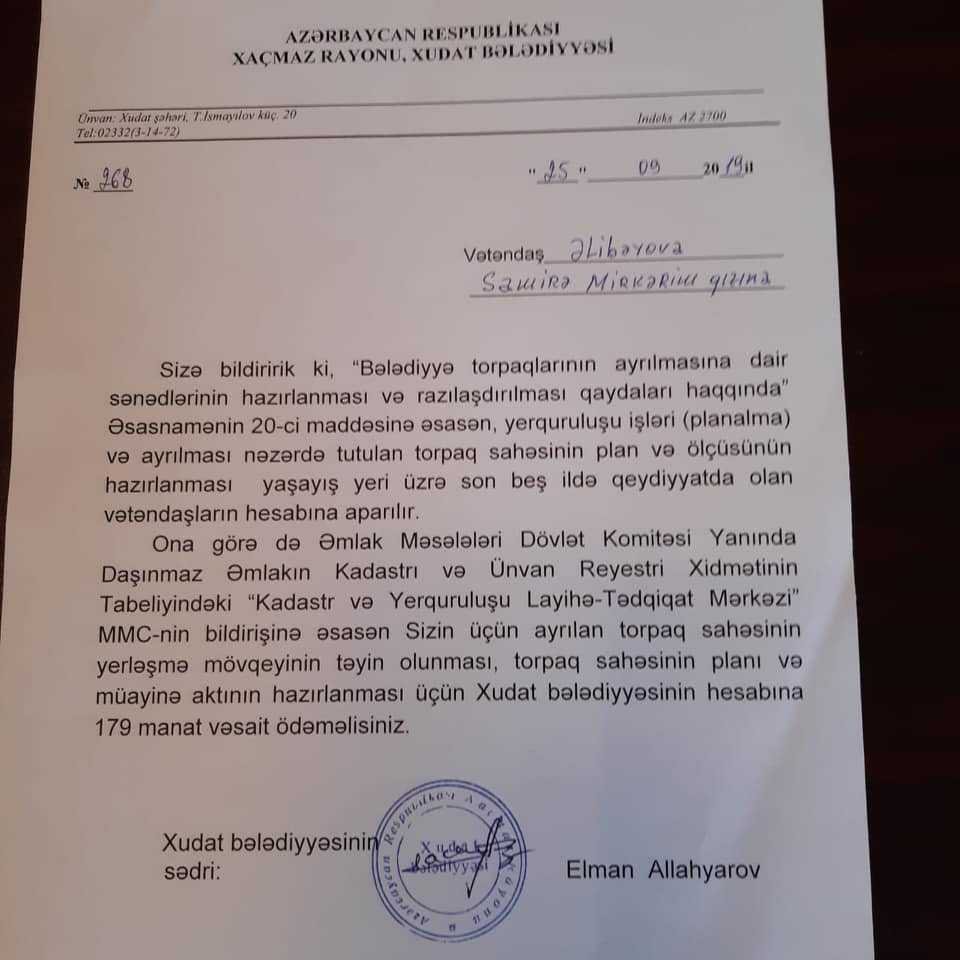 Xudat Bələdiyyə sədri Elman Allahyarovun məktubu