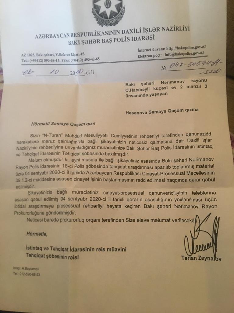 Səmayə Həsənova məhkəməyə müraciət edib. O, “N-Turan” şirkətə qarşı dəymiş mənəvi zərərə və dağıdılmış əşyalara görə 250 min manat və sahəsi 140 kvadratmetrdən az olmayan mənzil tələb edir.