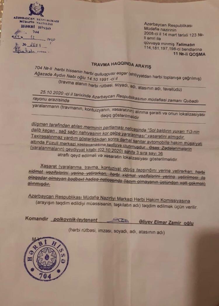 Nəbi Ağayev Meydan TV-yə danışır ki, oğlu döyüşlər başlanandan bir gün sonra – sentyabrın 28-də müharibəyə yollanıb. Aydın Ağazadə Füzuli, Cəbrayıl və Qubadlı uğrunda döyüşlərdə iştirak edib. Oktyabrın 24-də elə Qubadlıda da yaralanıb: “Ayağından yaralanıb. Sağ budunda, çanağa yaxın yerdə hazırda da qəlpə var. Əməliyyat olunanda həkimlər çıxarmayıblar. Deyiblər ki, qəlpə sinirlərin arasındadır. Bəlkə bir müddət keçəndən sonra yerini dəyişər, onda çıxararıq. Sol bazu nahiyəsindən də xəsarət alıb. Qolu çıxır…”