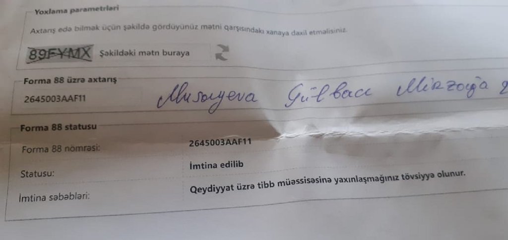 “Anamın çeşidli xəstəlikləri var, həmin xəstəliklər üzündən yataqdan qalxa, özünü fiziki idarə edə bilmir. Lerik Rayon Mərkəzi Xəstəxanasında həkim komissiyasından keçib, meyarları 1-ci qrup əlilliyə uyğun olduğuna görə sənədləri Lerik Rayon Tibbi-Sosial Ekspertiza Komissiyasına göndərilib. Ancaq uzun müddətdir ki, komissiya bizə imtina vərəqəsi göndərir və hər dəfə də imtina vərəqəsində eyni cümləni qeyd edir: “… Qeydiyyat üzrə tibb müəssisəsinə yaxınlaşmağınız tövsiyə edilir”. Xəstə anamı qucağımıza alıb yaxınlaşırıq xəstəxanaya, deyirik, bizə belə cavab verilib. Həkim deyir, biz hər şeyi qanun çərçivəsində yazıb göndərmişik, xəstəlikləri, vəziyyəti birinci qrup əlillik meyarlarına uyğundur. Sizi sadəcə, süründürürlər”, – şikayətçi deyir.