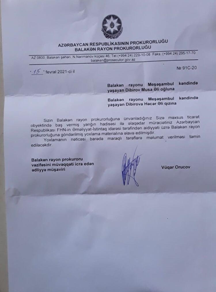 Balakən Rayon Prokurorluğundan isə bildirilib ki, Dibirovların yanğınla bağlı müraciəti qəbul edilib. Sözügedən hadisə ilə əlaqədar Fövqəladə Hallar Nazirliyinin Əməliyyat-İstintaq İdarəsinin prokurorluğa göndərdiyi yoxlama materiallarına əlavə edilib.