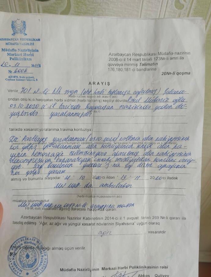 “Sənədlərdə nədənsə oktyabrın 3-də yaralandığım yazılıb. Sağ tərəfdən başımdan və qolumdan yaralanmışdım. Əvvəl Naftalanda xəstəxanada yatdım, əməliyyat etdilər. Sonra oktyabrın 9-dan 18-nə qədər Yevlax xəstəxanasında oldum. Ardınca Kürdəmirə göndərdilər. Axırda “Papanin” hospitalında bütün müayinələri elədilər. Dedilər ki, gözünüzdə böyük problem var, harada olsanız, sizi nəzarətdə saxlayacağıq. Mənə 30 günlük məzuniyyət verdilər”.