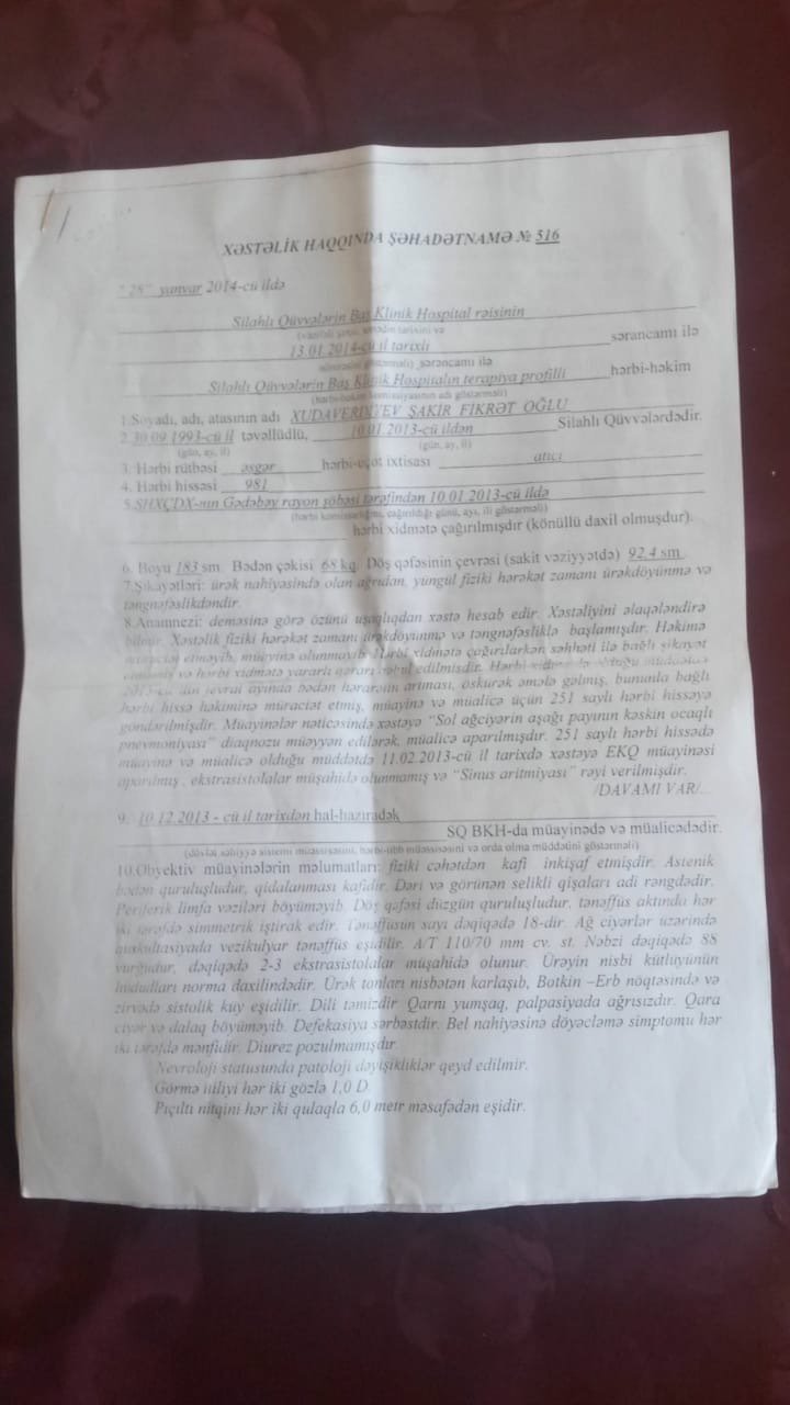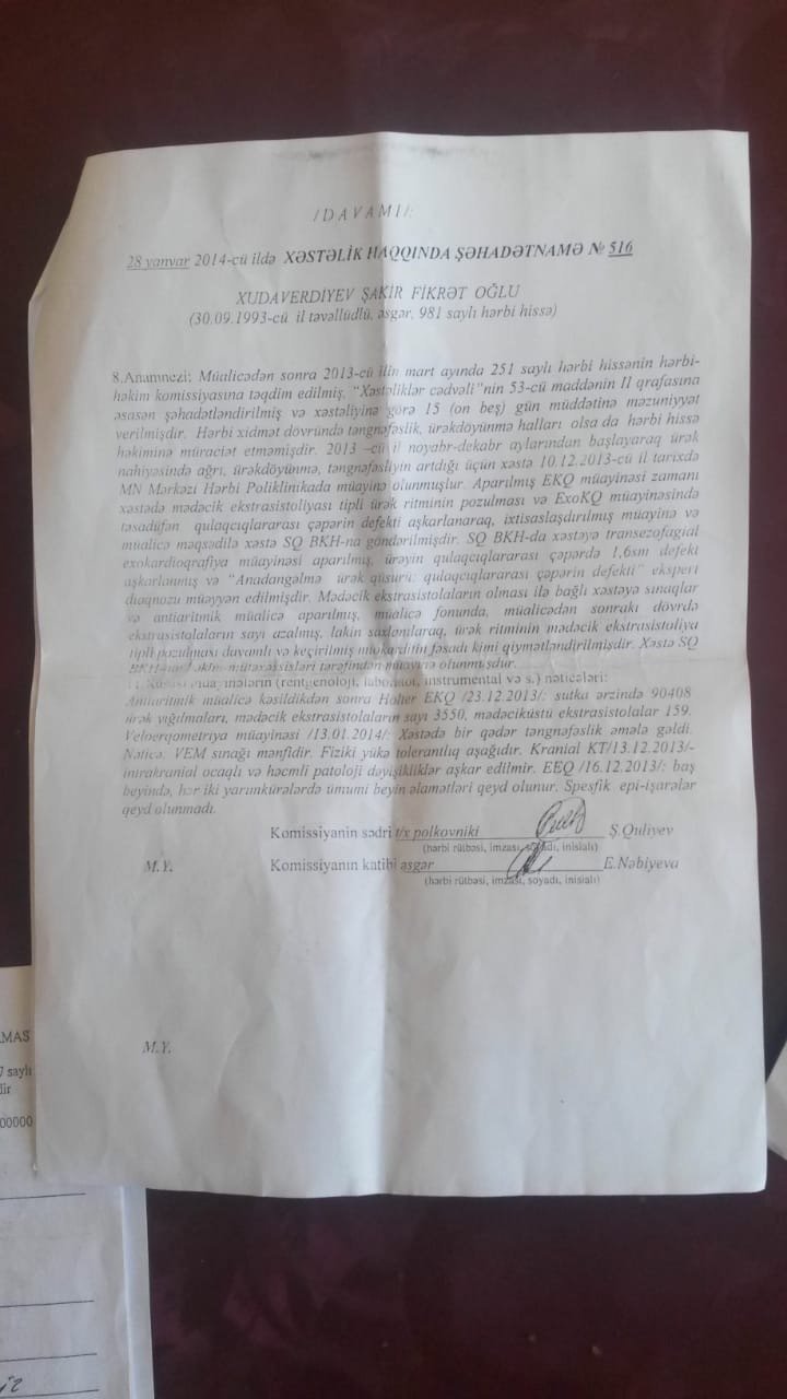 Gədəbəyin Söyüdlü kənd sakini, 28 yaşlı Şakir Xudaverdiyev Meydan TV-yə danışır ki, 7 il əvvəl hərbi xidmətdə olarkən onun anadangəlmə ürək qüsurlu olduğu aşkar edilib. Hərbi xidmətin 1 il 2 ayının tamamında üzə çıxan bu xəstəliyə görə ordudan tərxis olunub, 6600 manat kompensasiyası da ödənilib. Evə döndükdən sonra ürək əməliyyatı keçirib. Həmin vaxtdan Şakirə 2-ci qrup əlillik təyin olunub. Ancaq bu ilin martında əlilliyi ləğv edilib. Ona əlilliyini təsdiq edən tibbi sənədləri yenidən toplamağı və Tibbi-Sosial Ekspert Komissiyasına yenidən müraciət etməyi məsləhət görüblər.