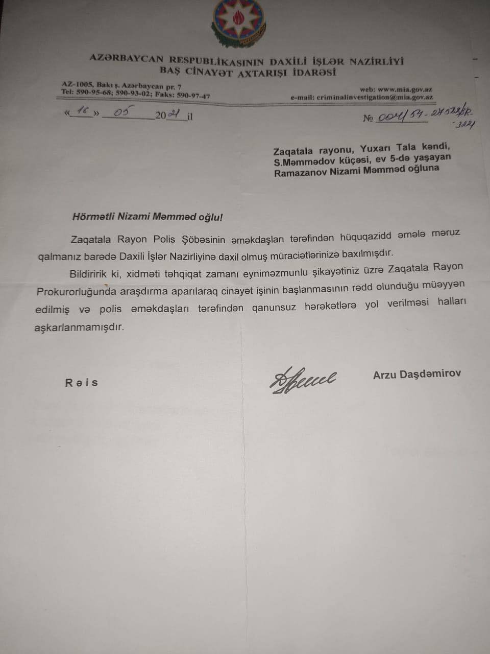 Daxili İşlər Nazirliyinin Mətbuat Xidmətinin KİV və İctimaiyyətlə əlaqələr şöbəsinin rəisi Elşad Hacıyev Meydan TV-yə məsələnin araşdırılacağını deyib. Bundan sonra DİN-in Baş Cinayət Axtarış İdarəsindən Nizami Ramazanova cavab məktubu göndərilib. Həmin məktubda bildirilir ki, araşdırılıb, polisin rəftarında qanunazidd hərəkətlərə yol verilməsi halı aşkarlanmayıb.