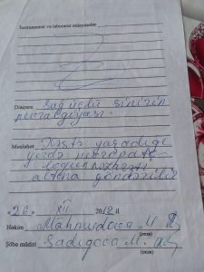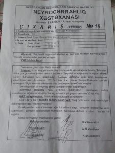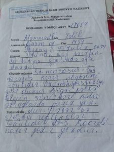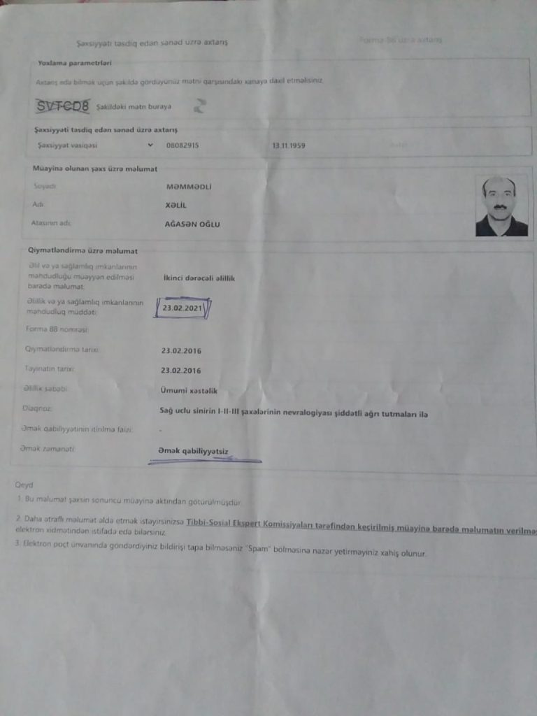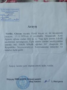 “Əlillik pensiyasının yenidən təyin edilməsi üçün rayonun Dövlət Sosial Müdafiə Fonduna (DSMF) müraciət etdim. Ancaq oradan bildirdilər ki, əlillik pensiyası Əmək və Əhalinin Sosial Müdafiəsi Nazirliyi (ƏƏSMN) tərəfindən dayandırılıb. Dedilər “get Bakıya, onlara şikayət elə”. Mən də mart ayında Bakıda Tibbi-Sosial Ekspert Komissiyasında oldum. Bütün sənədlərim Göyçay rayon Mərkəzi Xəstəxanası tərəfindən ƏƏSMN-nin alt sisteminə daxil edildi. Ancaq “müalicə olunmaq tövsiyyəsi verilib” adı ilə imtina cavabı gəldi”.