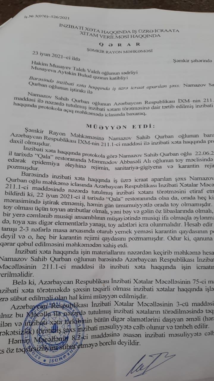“Tural Zeynalovun obyektində bundan əvvəl də 7 dəfə karantin rejiminin pozulması aşkar edilərək, barəsində inzibati tədbir görülüb. Bundan başqa o, polis əməkdaşları tərəfindən dəfələrlə edilən xəbərdarlıqlara baxmayaraq, komendant rejimini və karantin qaydalarını pozduğuna görə, barəsində İnzibati Xətalar məcəlləsinin 510 (xırda xuliqanlıq), 517 (fövqəladə vəziyyət rejiminin tələblərinin pozulması ), 535-ci (polis işçisinin və ya hərbi qulluqçunun qanuni tələbinə qəsdən tabe olmama) maddələri ilə təqsirli bilinərək protokol tərtib edilərək rayon məhkəməsinə göndərilib. Məhkəmənin qərarı ilə Tural Zeynalov 15 sutka inzibati həbs olunub”.