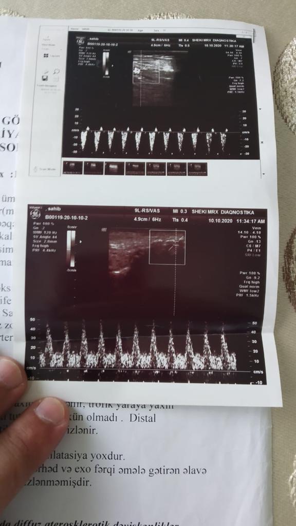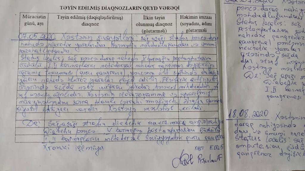 S. İsayevə “Sağ aşağı tərəfin V barmağının yaş qanqrenası (E11.5). Sağ ayağın diabetic fleqmonası (F40.9). Şəkər diabet xəstəliyi II tip ağır forma (E11). Ü.İ.X. Keçirilmiş miokard infarktı (125.2)” diaqnozu təyin edilib.