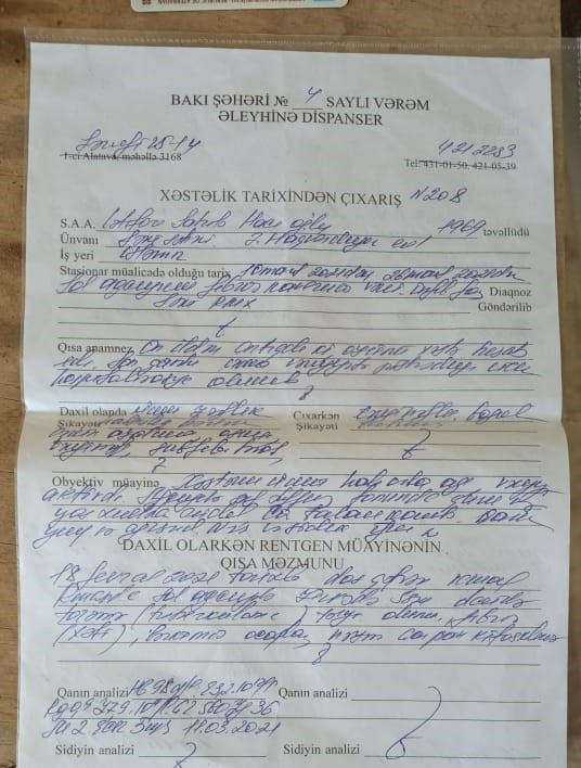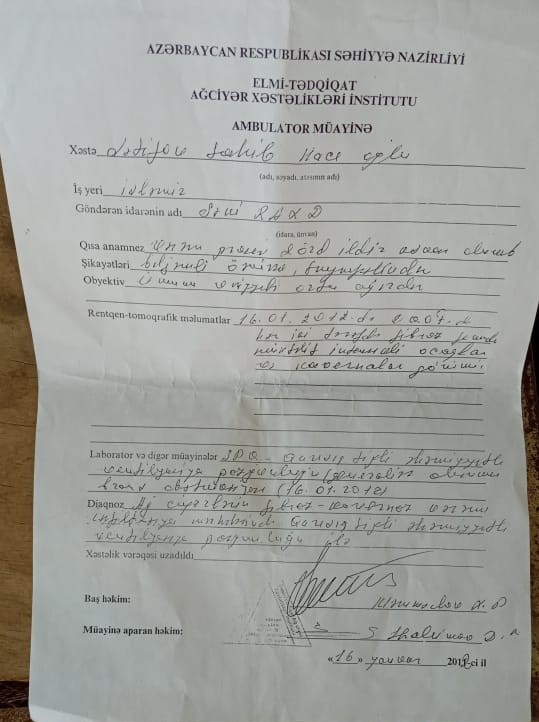 “Həmin sənədi gətirib Şəkidəki Vərəm Dispanserinə təqdim elədim. Bir müddətdən sonra yaxınlaşıb cavab haqqında məlumat almaq istədim. Əvvəl dedilər ki, cavab yoxdur, gah da dedilər sənədi gətirməmisən. Sonradan məlum oldu ki, həkim komissiyasından gətirdiyim sənəd dispanderdə itib.”
