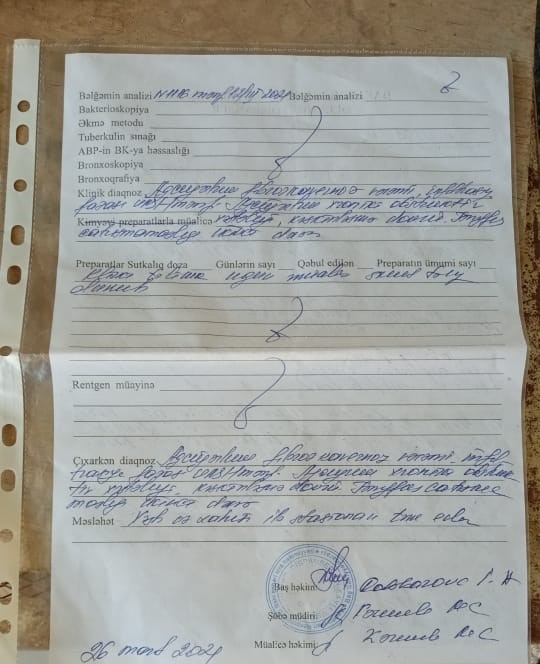 Şikayətçi bildirir ki, mart ayında Bakıda 4 saylı Vərəm Əleyhinə Dispanserdə on beş gün müalicə alıb. Ona dispanserdən xəstəliyinin ən ağır formada olması ilə bağlı rəy verilib.