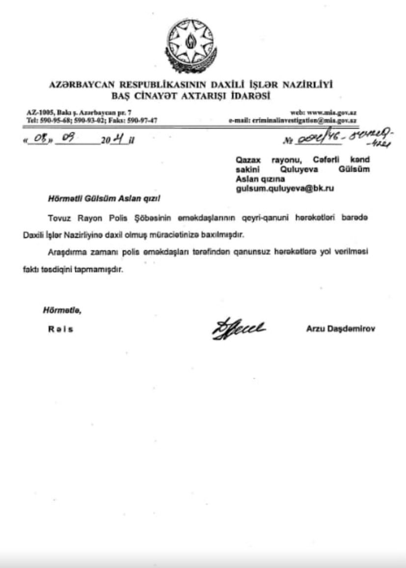 Daxili İşlər Nazirliyinin Baş Cinayət-Axtarış İdarəsinin rəisi Arzu Daşdəmirov isə cavab məktubunda yazıb ki, Tovuz Rayon Polis Şöbəsinin əməkdaşları tərəfindən qanunsuz hərəkətə yol verilməsi faktı təsdiqini tapmayıb.