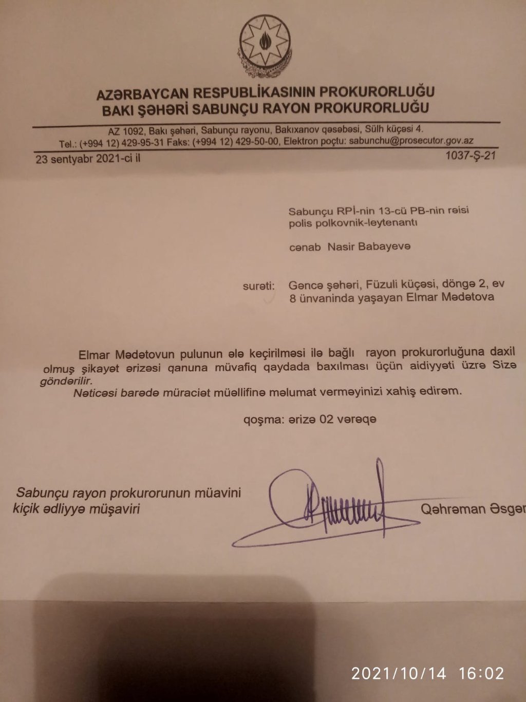 Sabunçu Rayon Polis İdarəsinin 13-cü polis bölməsindən Meydan TV-yə bildirilib ki, Sabunçu Rayon Prokurorluğu bu il sentyabrın sonunda Elmar Mədətovun ərizəsini araşdırılması üçün bu bölməyə göndərib. Ərizə araşdırılır və bu barədə ərizəçiyə məlumat veriləcək.