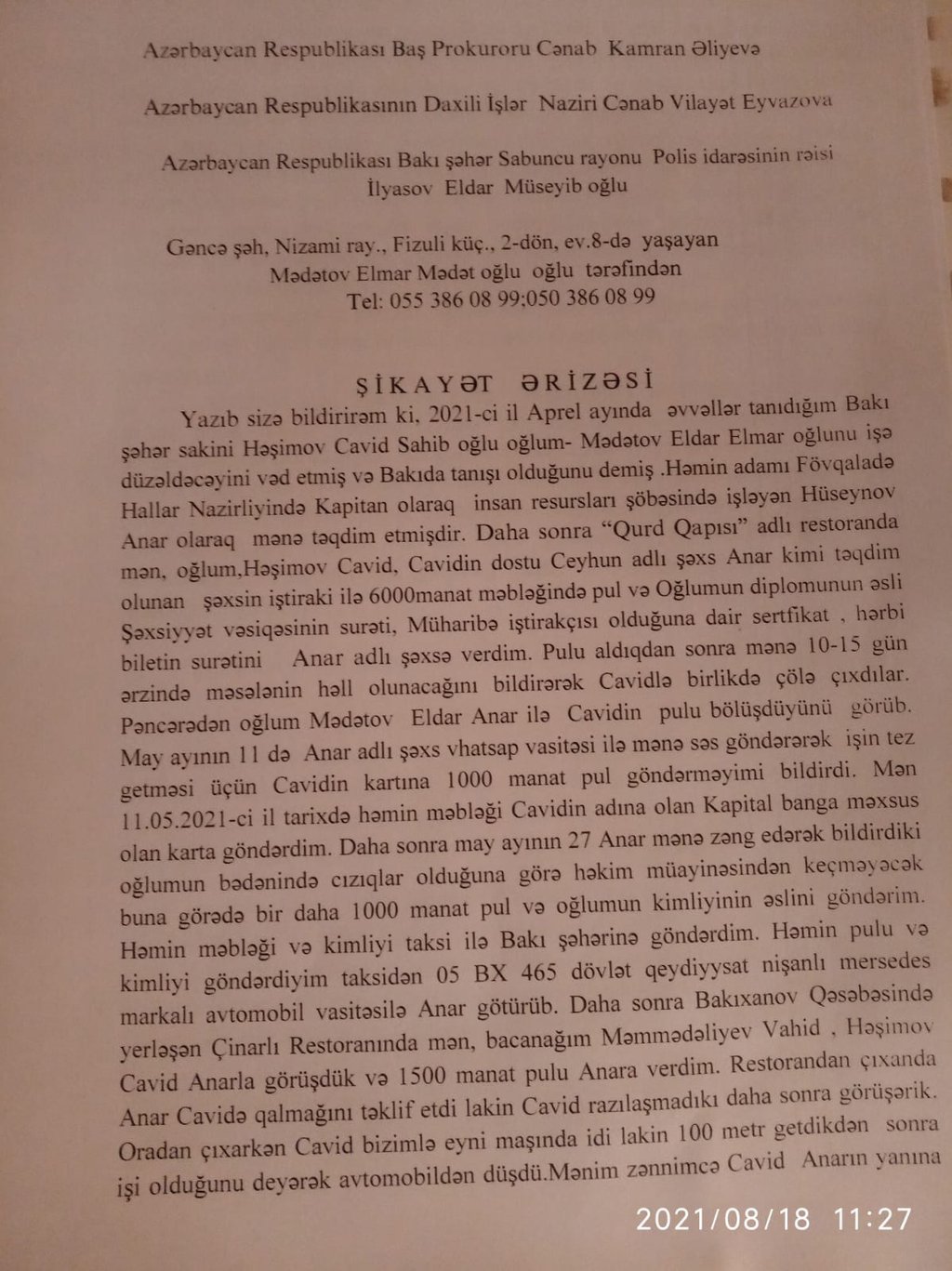 Elmar Mədətov deyir, mayın 11-də Anar adıyla tanıdığı həmin şəxs ona “Whatsapp” üzərindən səsli ismarıc göndərərək işin tezləşdirilməsi üçün əlavə 1000 manat tələb olunduğunu bildirib və pulu Cavidin bank kartına köçürməsini xahiş edib. Elmar Mədətov 1000 manatı Cavid Həşimovun bank kartına köçürüb. Mayın 27-də həmin şəxs Elmar Mədətovdan yenə də pul istəyib: