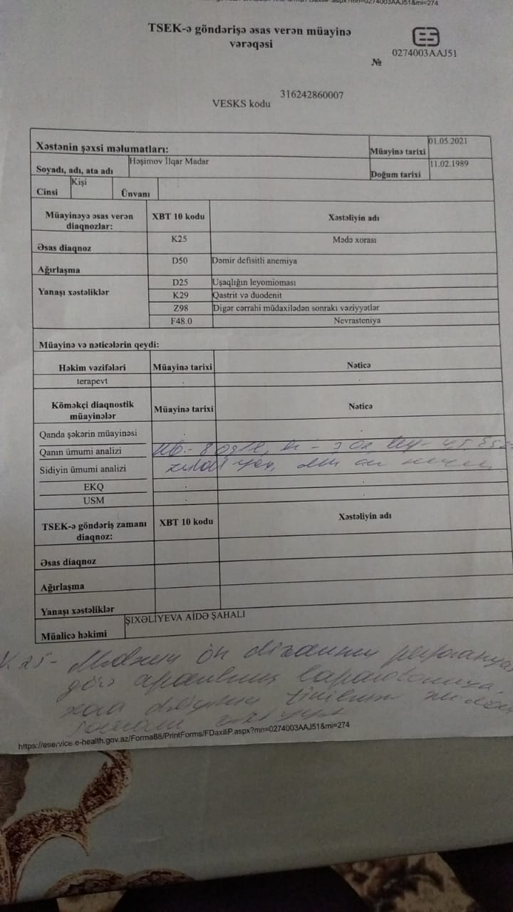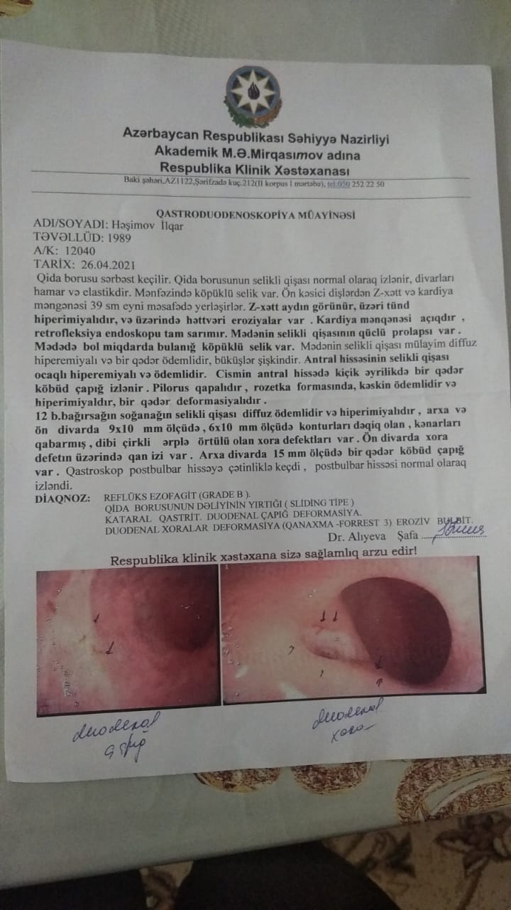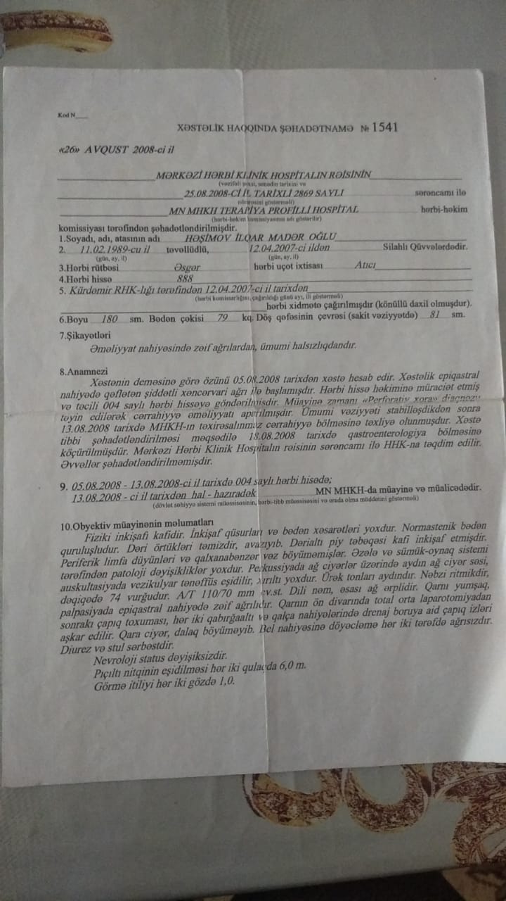 “Aprel ayında həkim komissiyasından keçmək vatım da tamam olduu üçün Kürdəmir rayon Mərkəzi Xəstaxanasına yaxınlaşdım. Mən heç vaxt xəstəxanada yatıb müalicə almamışam. Bu dəfə də xəstəxanada endoskopiyadan keçdim, zond uddum və mənə təkrar abulator müalicə yazıldı. Daha sonra göndərişlə məni Bakıya, Respublika Klinik Xəstəxanasına göndərdilər”.