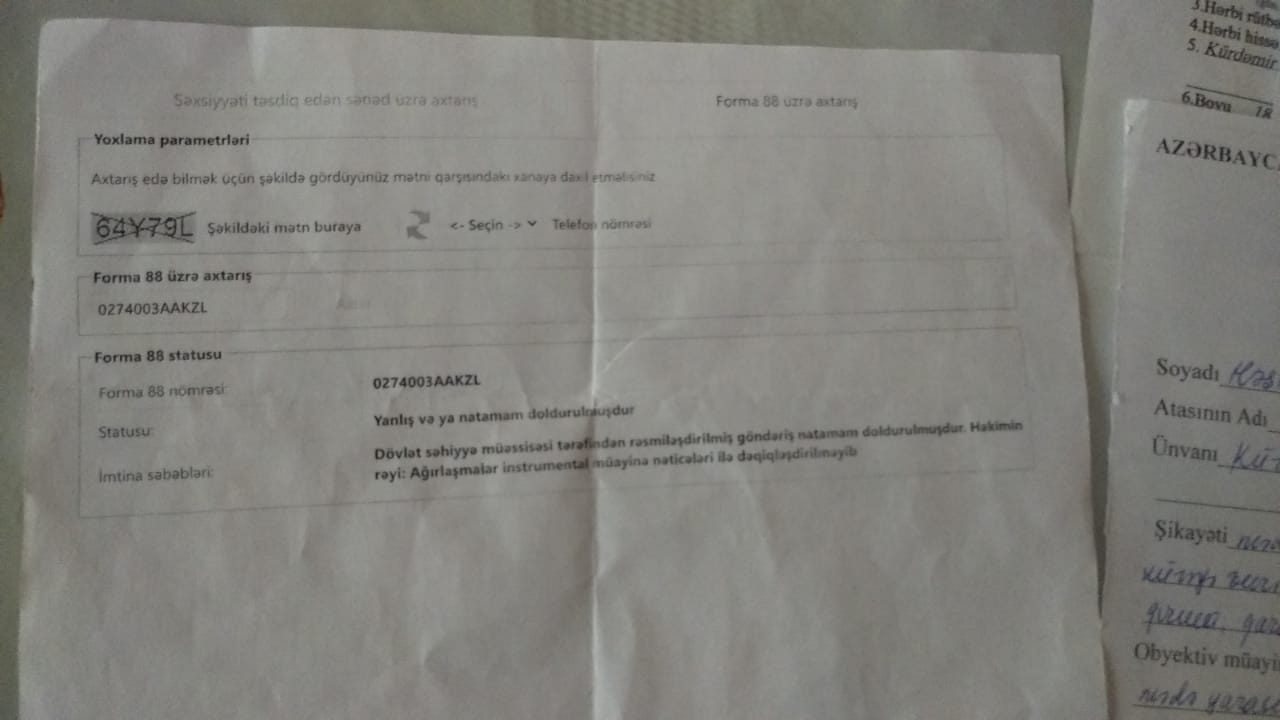 “İmtina cavabı ilə bağlı Mərkəzi Xəstəxanaya müraciət etdim. Bildirdilər ki, Regional Komissiyaya yaxınlaşıb daha ətraflı məlumat ala bilərəm. RK-dan isə bildirdilər ki, sən xəstəxanada yatmamısan, buna aid sənədlər yoxdur. Ona görə də, sənə imtina cavabı gəlib”.