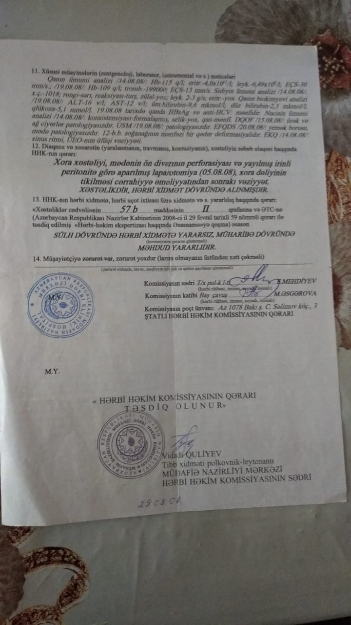 “Respublika Klinik Xəstəxanasından aldığım sənədləri Kürdəmir rayon Mərkəzi Xəstəxanasına göndərdim. Xəstəxanadan da bütün sənədlər baxış keçirilməsi üçün Ragional Komissiyaya təqdim edilib. Daha sonra onlarla görüş keçirildi, əyani baxış oldu və söhbət edildi. Həmin vaxt orada məndən başqa 7-8 nəfər hərbiçi yoldaşlar, qazilər də var idi”.