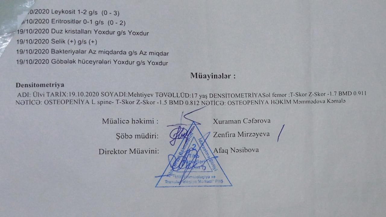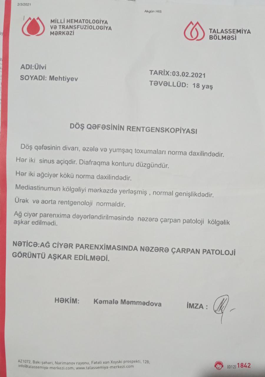 Daha sonra Zahid Mehdiyev 03.02.2021- ci ildə Respublika Talasssemiya Mərkəzindən “ambulator xəstənin tibbi kartasından çıxarış” edərək sənədləri Tibbi-Sosial Ekspert Komissiyasına (TSEK) təqdim edib. Ancaq bir müddətdən sonra ona “natamam doldurma” ilə imtina cavabı gəlib. Ülvi Mehdiyevin sənədləri təkrar TSEK-na təqdim edilsə də, hələ də nə təsdiq, nə də inkar cavabı gəlməyib.