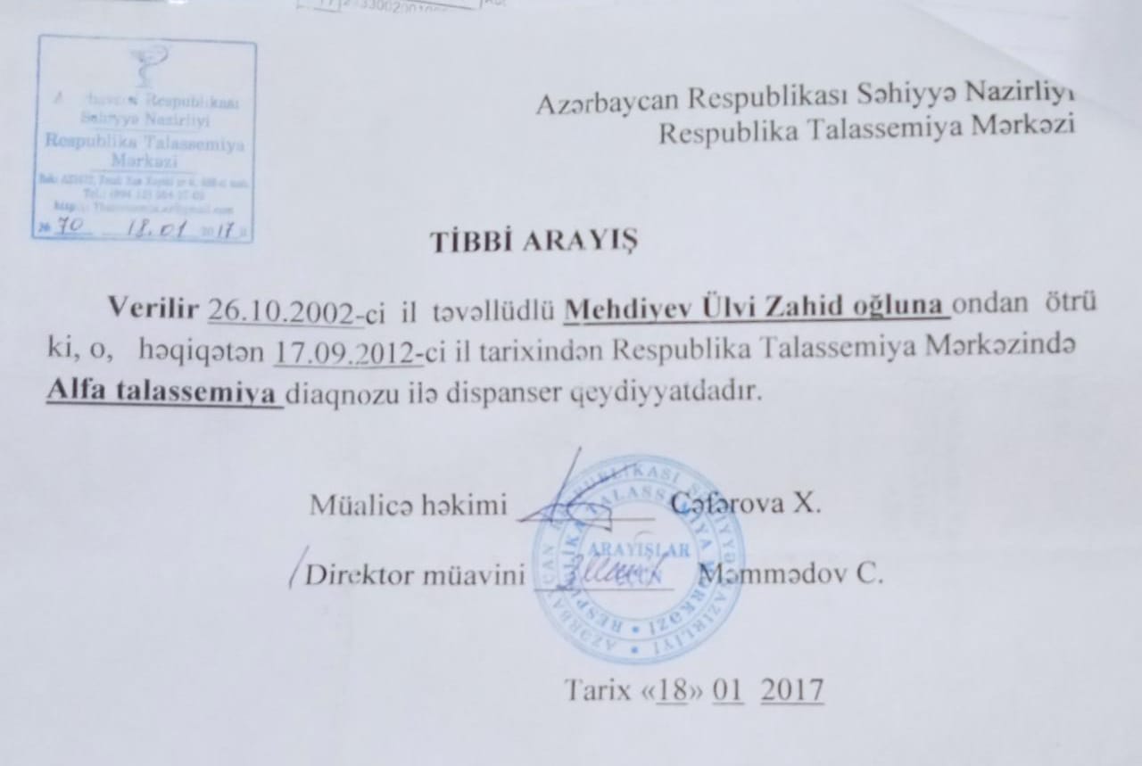 “Gözətçi” xəbər verir ki, bu barədə, Kürdəmir rayon, Qarabucaq kənd sakini Zahid Mehdiyev bildirib. Onun sözlərinə görə, oğlu Ülvi Mehdiyev (26.10.2002-ci il təvəlldlü) 17.09.2012-ci ildən “Alfa Talassemiya” diaqnozu ilə Respublika Talassemiya Mərkəzində qeydiyyatdadır və oğlu hər ay həmin mərkəzdə pulsuz tibbi müayinədən keçirilib.