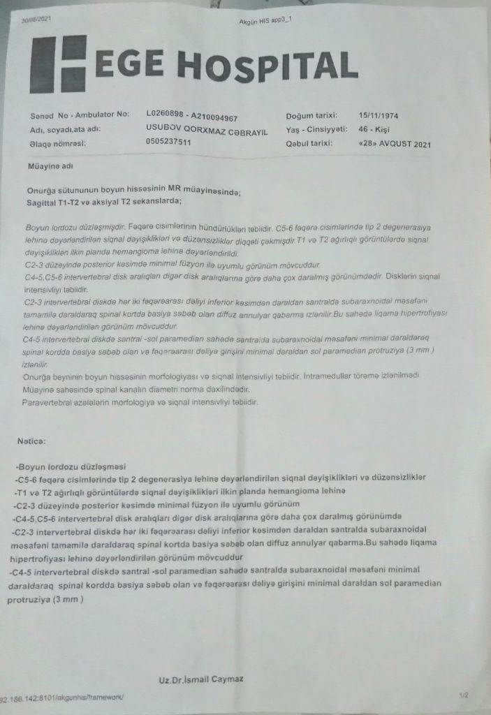 “Sonuncu dəfə isə on gün (20.04.2021-30.04.21 ci il) Bakı şəhər 3 saylı Klinik xəstəxanasında stasionar müalicə almışam. Amma buna baxmayaraq, boyun və bel ağrılarım, baş gicəllənmə, eləcə də, kəllə beyin sinirləri hələ də aktivdir. Onurğa sütununda hərəkət məhdudlaşdığından paravertebral köklər beldə ağrılar törədir və bu da mənim hərəkətimi çətinləşdirir”.