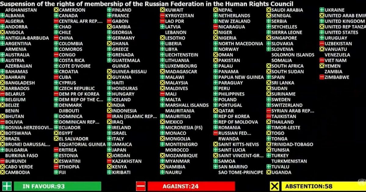Aprelin 7-də BMT Baş Assambleyası Rusiyanı İnsan Hüquqları Şurasından çıxaran qətnamə qəbul edib.