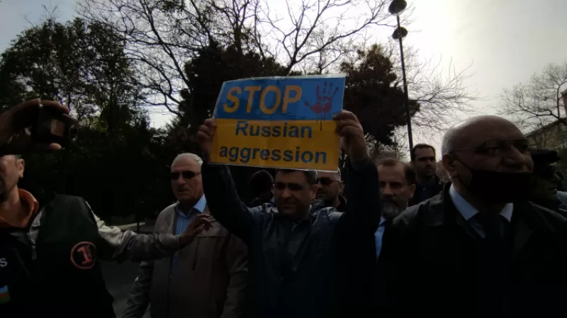 Aksiya iştirakçıları jurnalistlərə bildiriblər ki, Rusiyanın Ukraynaya qarşı təcavüzünə, bu ölkə sakinlərinin kütləvi qətlinə etirazlarını bildirməyə gəliblər.