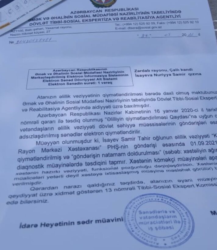 Əmək və Əhalinin Sosial Müdafiəsi Nazirliyinin tabeliyində olan Dövlət Tibbi-Sosial Ekspertiza və Reabilitasiya Agentliyinin cavabı