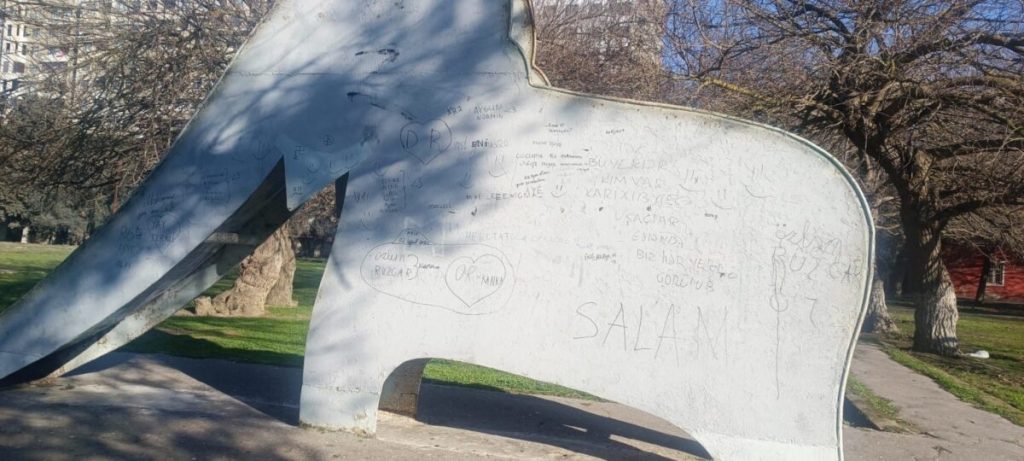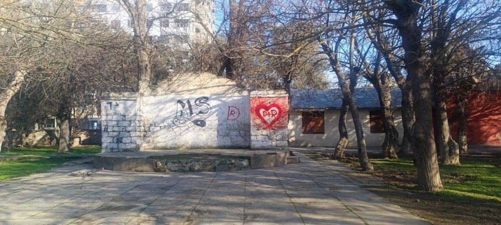 Parkın sağ tərəfindəki teatr səhnəsindən yalnız bir divar qalıb. Həmin divarda da sevgi etirafları həkk olunmuş yazılar var…