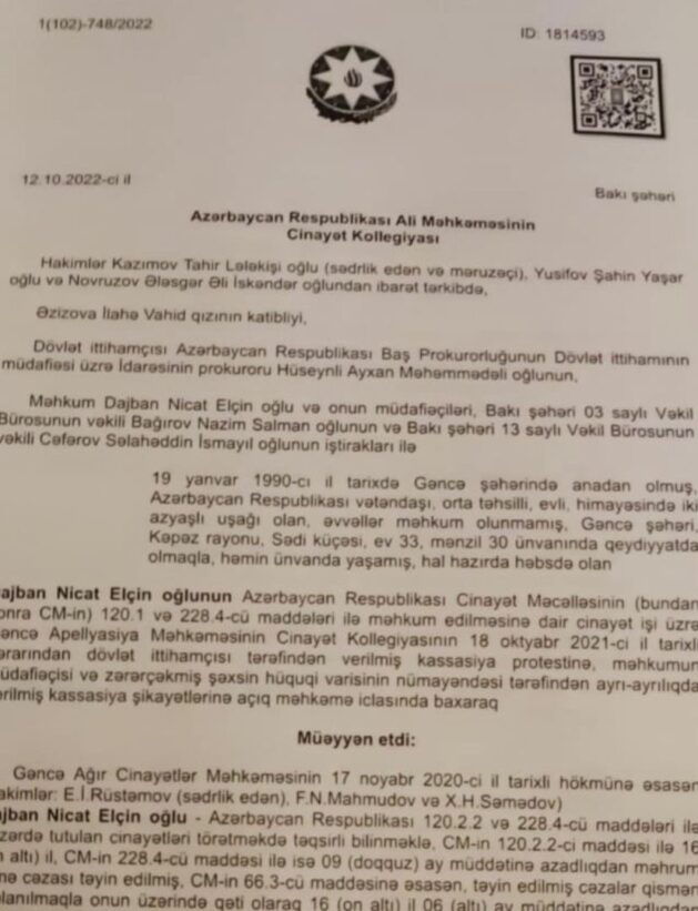Ali Məhkəmə  təqsirləndirilən şəxsə “yox” desə də, zərərçəkmiş tərəfin kassasiya şikayətinə və prokurorluğun protestinə münasibətdə Gəncə Apellyasiya Məhkəməsinin qərarını ləğv edib. İş yenidən araşdırılması üçün bu instansiyaya qaytarılıb.
