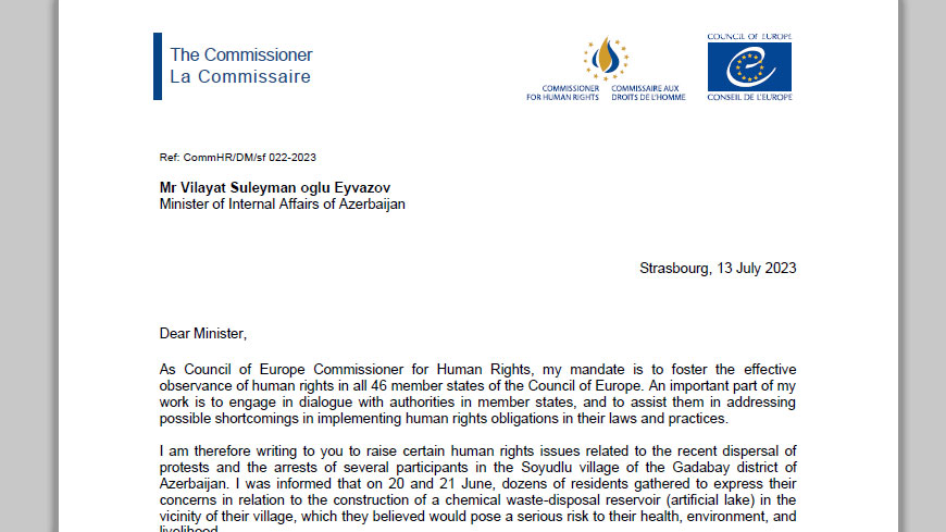 Avropa Şurasının insan hüquqları üzrə komissarı Dunya Miyatoviç Azərbaycanın Daxili İşlər naziri Vilayət Eyvazova ünvanladığı məktubunda Azərbaycanın Gədəbəy rayonunun Söyüdlü kəndində son vaxtlar ekoloji etirazların dağıdılması və iştirakçıların həbsindən narahatlığını ifadə edib.