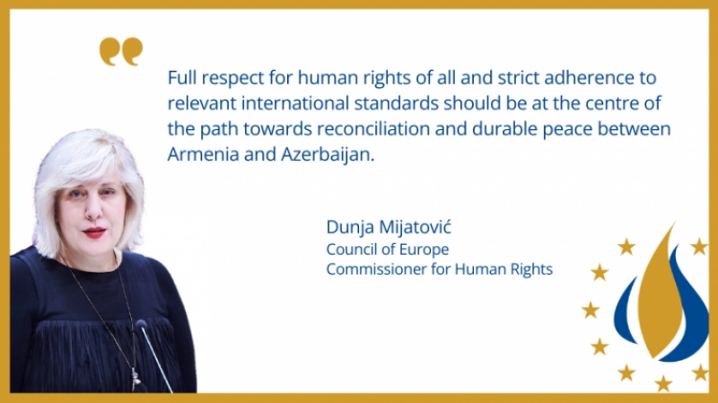 “İnsan hüquqlarının pozulması Qarabağ regionunda və onun ətrafında Ermənistan və Azərbaycan arasında uzunmüddətli münaqişənin son fəslində əlamətdar olub. Hamı üçün insan hüquqlarına tam hörmət və müvafiq beynəlxalq standartlara ciddi şəkildə riayət olunması iki ölkənin barışığı yolunda diqqət mərkəzində olmalıdır”, deyə Avropa Şurasının insan hüquqları üzrə Komissarı Dunya Miyatoviç Qarabağ regionu da daxil olmaqla, Ermənistana və Azərbaycana 16-23 oktyabr tarixlərində baş tutan səfəri başa çatdıqdan sonra bildirib.